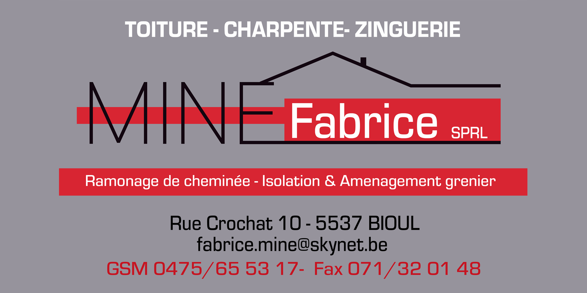 L’entreprise Mine Fabrice SPRL, située à Bioul, fourni de nombreux services très variés tels que: Toiture, Charpente, Zinguerie, Ramonage de cheminée, Isolation et Aménagement de grenier, Réalisation de bardage, Pose de panneaux solaires et d’autres encore.
